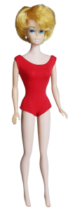 Blonde Barbie Bubble Cut #850, Mattel, 1964-65. En väldigt fin BC, som kommer i sin originalbaddräkt. Nagellacket på tårna är helt intakt. På fingrarna återstår ca 90 %. Håret är väldigt fint, likaså ansiktsmålningen, som är helt intakt. Hon har hål i öronen, men inget grönt. Kommer med reproörhängen. Hon är märkt: Midge T.M./©1962 Barbie ®/©1958 by Mattel, Inc. Patented. Se fler bilder.