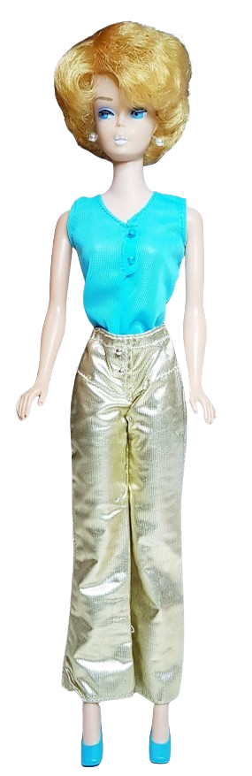 Barbie Glowin´ Gold #3354, Mattel, 1972. Ett komplett set i mycket fint skick (NM). Inte vanligt att de guldfärgade byxorna håller så fint i färg som dessa. Både top och byxa har kvar sina små knappar. Skorna (Turquoise Square Toe Shoes) är också i mycket fint skick och är märkta Japan. Båda plaggen knäpps med tryckknapp. Se fler bilder, dockan ingår ej i köpet.