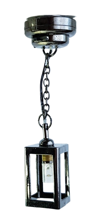 Taklampa av svart metall. Av- och påknapp på foten, där även batteriet sitter. Batteri samt magnet för fäste i tak medföljer.