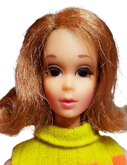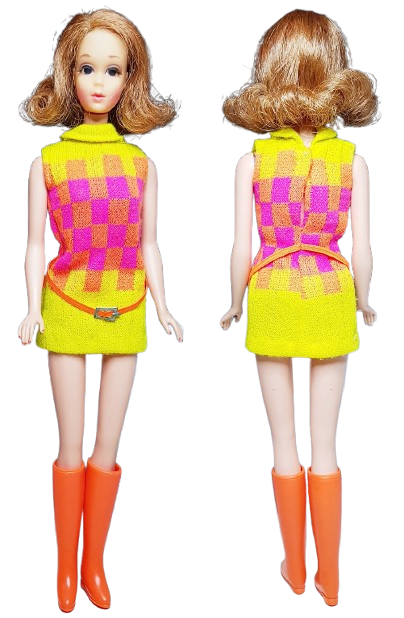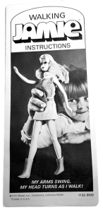 Walking Jamie Titan #1132, Mattel, 1970. En mycket fin Jamie både vad gäller smink, hår och kropp. Hennes "Walking-knapp" på ryggen fungerar fortfarande. Hon rör både huvud, armar och ben. Hon bär sina originalkläder och stövlar. Broschyren medföljer också. Hon är märkt: ©1967 Mattel, Inc. U.S. Patented Patd. Canada 1967 other Pats. Pend Japan. Se fler bilder.